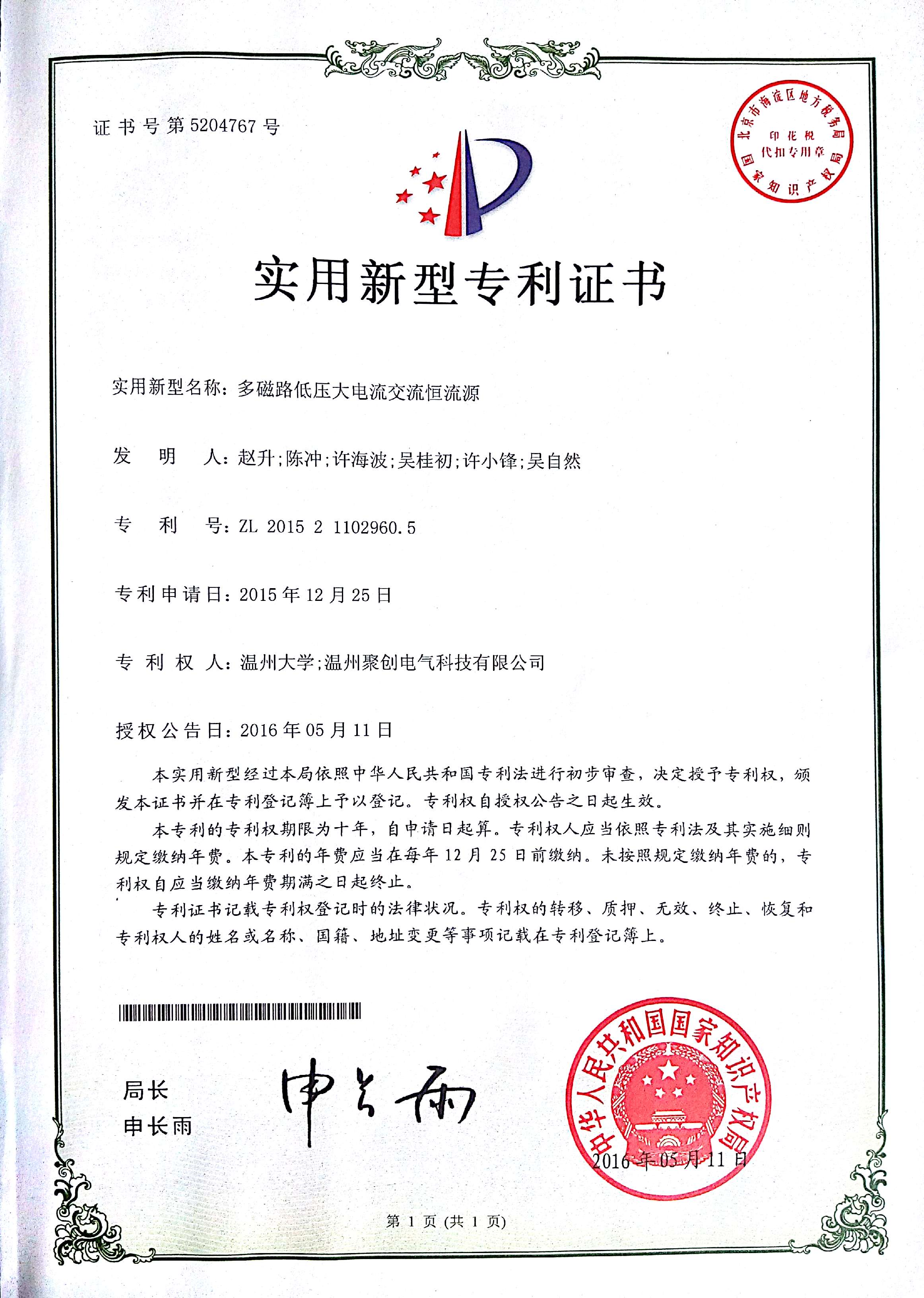 實用新型專利(多磁路低壓大電流交流恒流源)